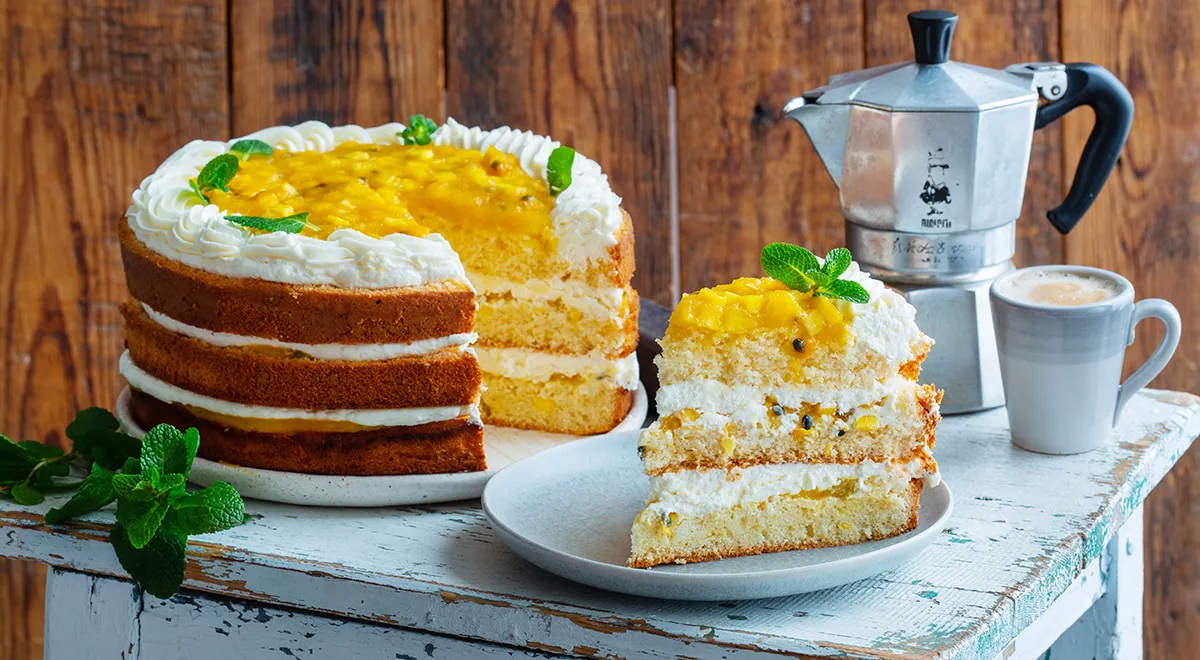 Reikės (6 porcijoms): biskvitui: 5 kiaušinių, 150 g smulkaus cukraus, 1 šaukštelio vanilinio cukraus, druskos – ant peilio galiuko, 160 g miltų, 0,5 šaukštelio kepimo miltelių; kremui: 300 ml riebios grietinėlės, 250 g kreminio sūrelio, 50 g miltelinio cukraus; vaisių tyrei: 500 g prinokusių mangų, 80 g cukraus, 1 pasifloros.