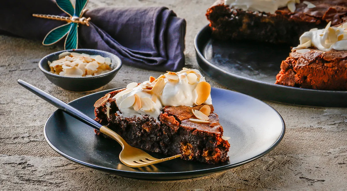 Reikės (8 porcijoms): 350 g juodojo šokolado, 225 g sviesto, 300 g cukraus, 100 g tešlainių, 5 kiaušinių, migdolų lapelių – papuošti.