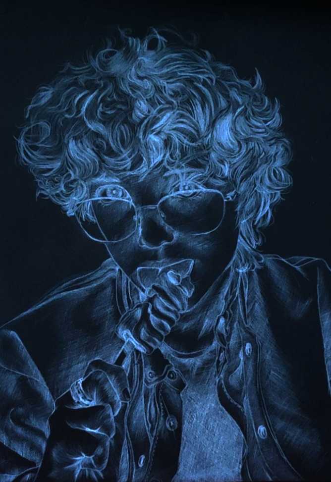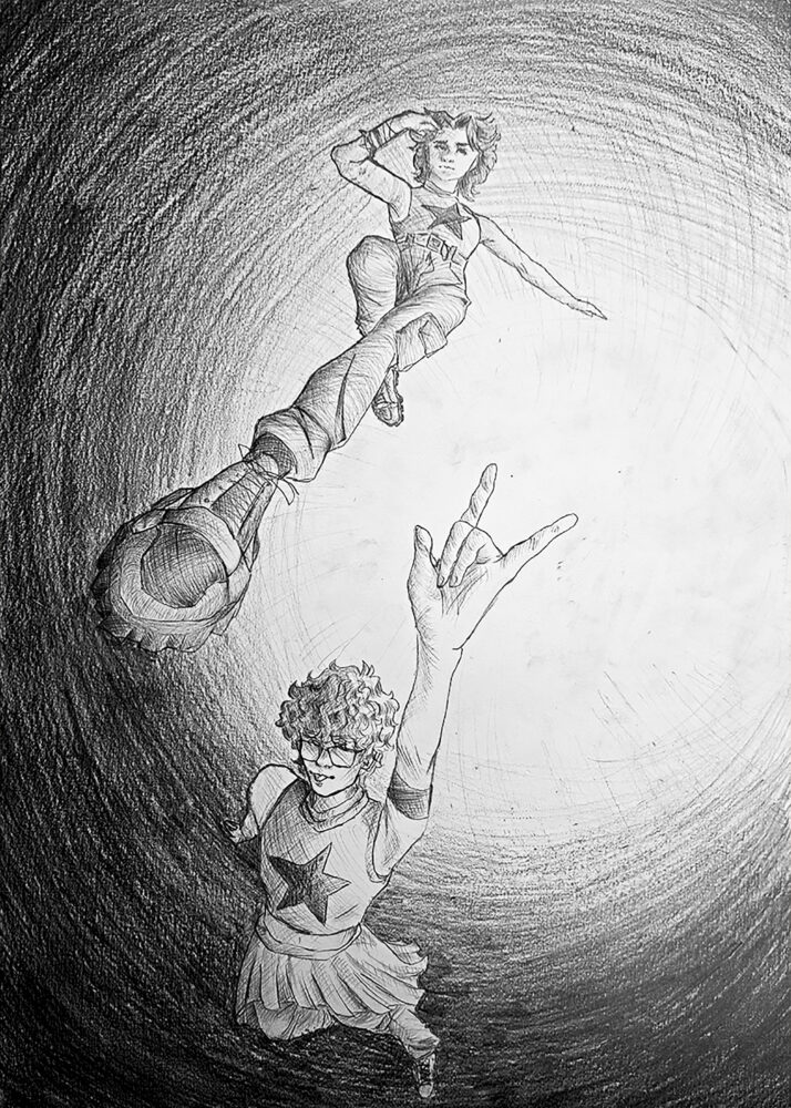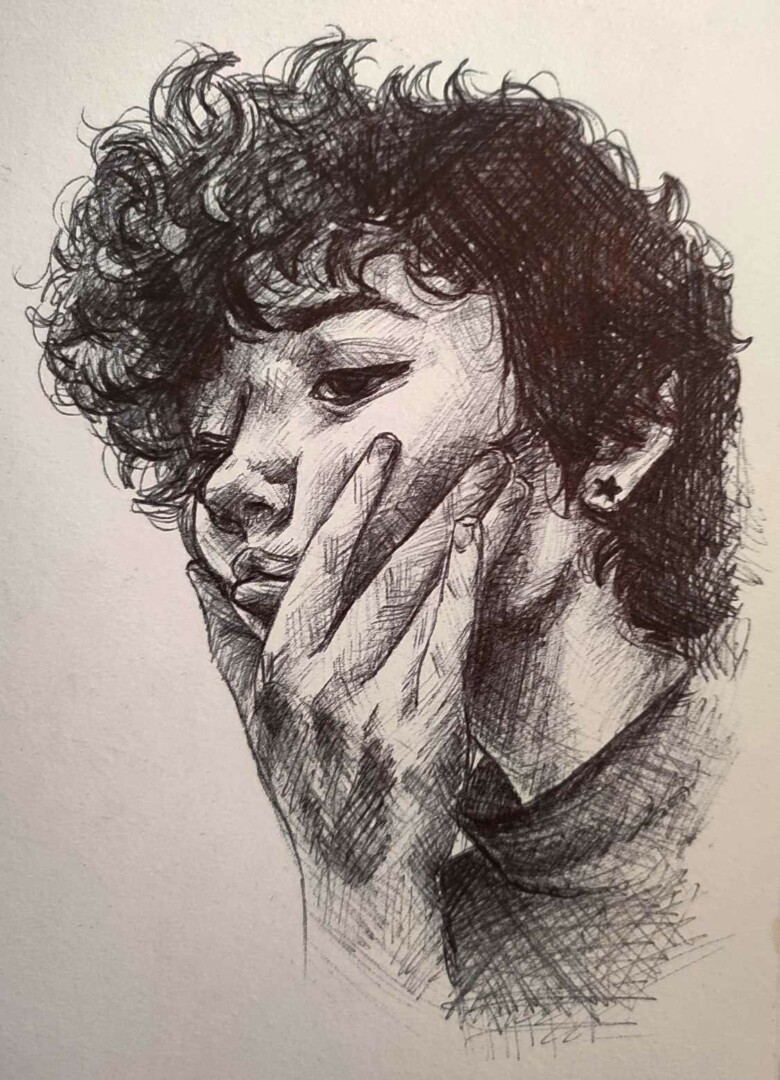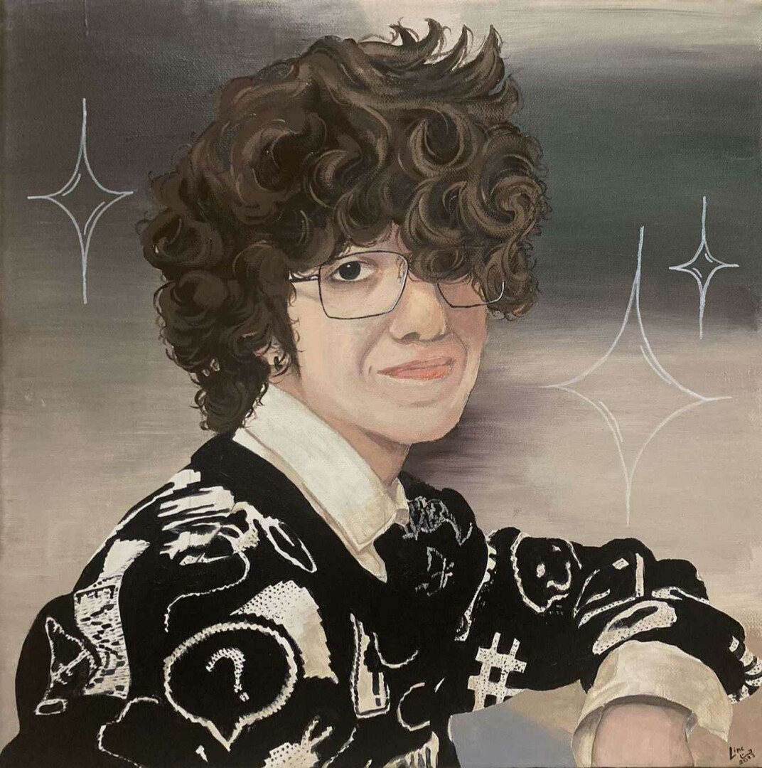 Jaunosios dailininkės, „Sidabrinio Nevėžio“ Metų iliustruotojos, Panevėžio Vytauto Mikalausko menų gimnazijos abiturientės Gabrielės Burkaitės piešiniuose – žmogus. Kitaip sakant, superherojus kaip iš filmo: garbanotais, vešliais plaukais, skvarbaus žvilgsnio. Kas tas paslaptingasis, žino tik pati piešinių autorė, bet akivaizdu, kad jis – kūrėjos didžiausias įkvėpimo šaltinis.