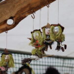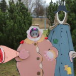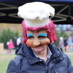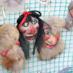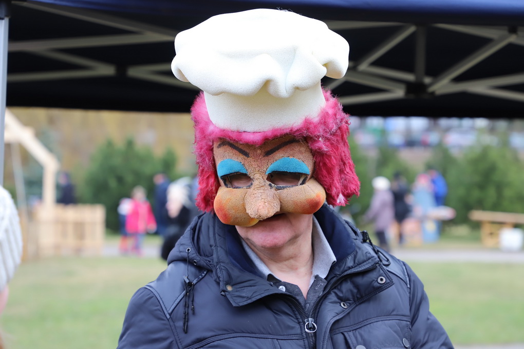 autodailininkė Jūratė Abromavičienė su vyru. Sekmadienio šventei prie Panevėžio bendruomenių rūmų jie papjė mašė technika per pusantro mėnesio prigamino apie šimtą skirtingų veidų. Viena kaukė kainavo nuo 5 iki 7 eurų, tačiau besidominčių jomis netrūko.
