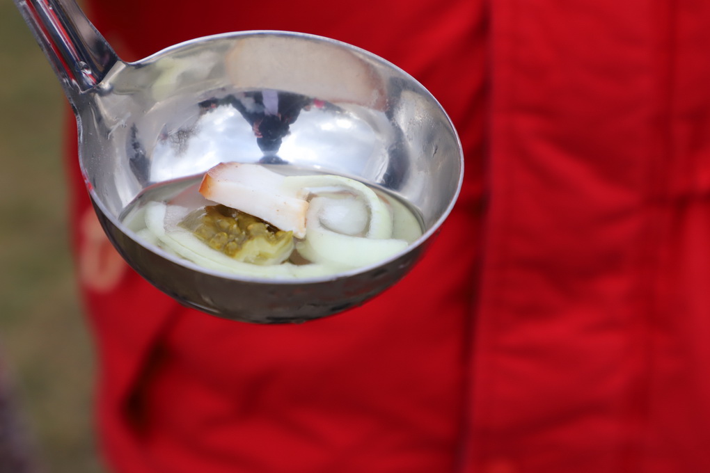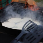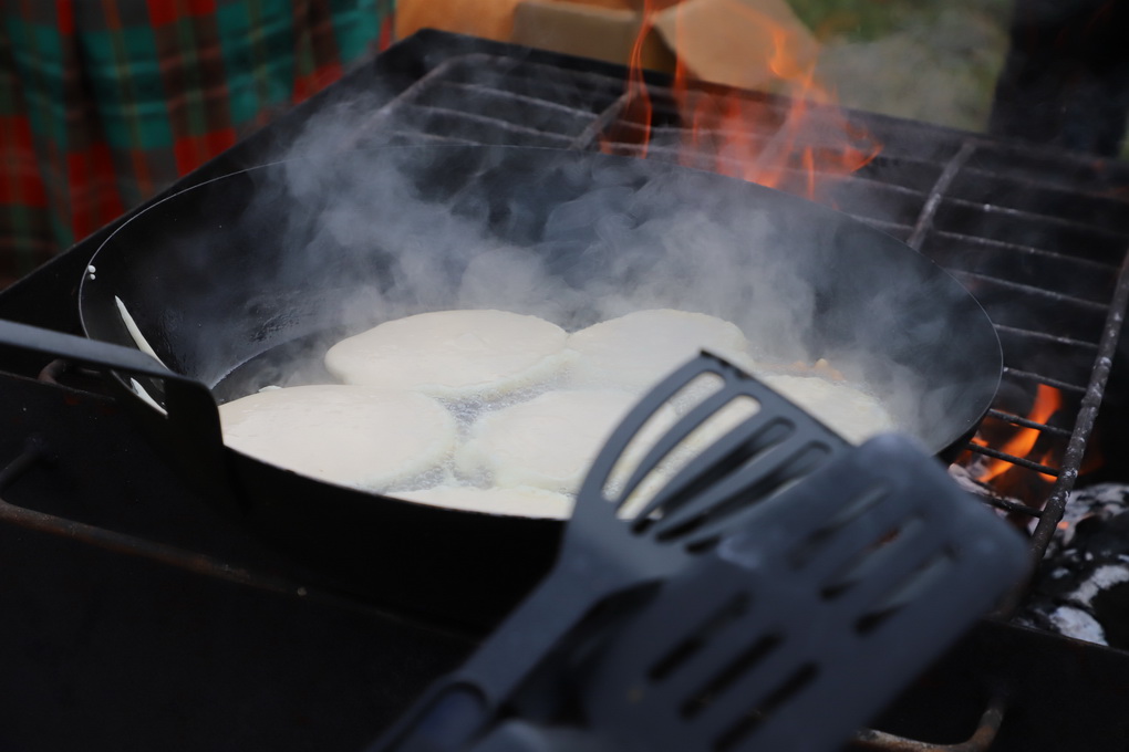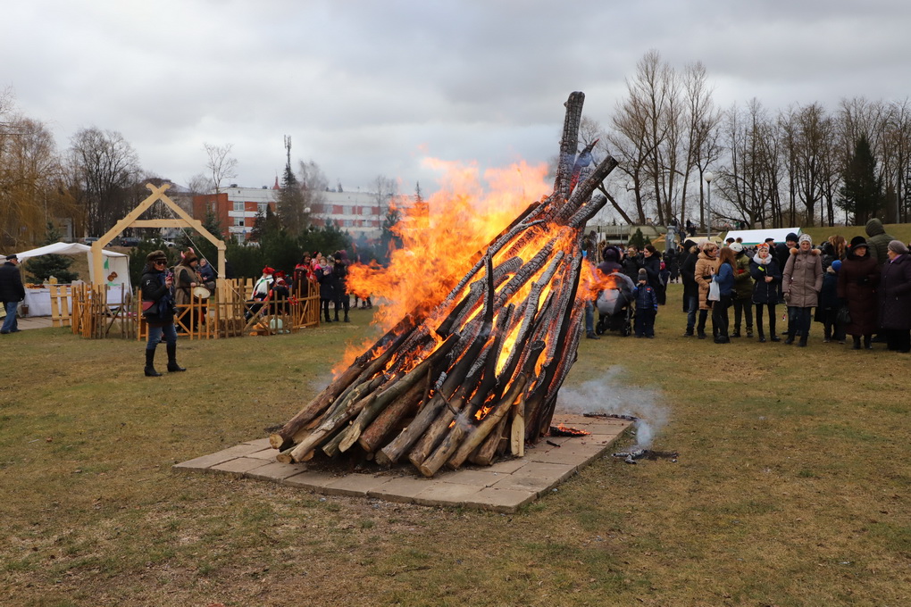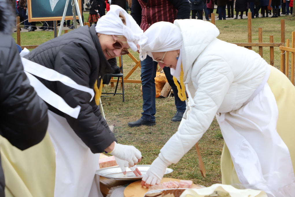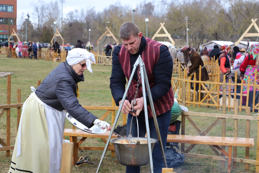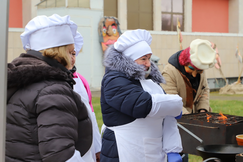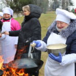 Moteris su sūneliu būtinai žadėjo paragauti blynų, be kurių neįsivaizduojamos Užgavėnės. Panevėžio bendruomenių rūmai šiuo patiekalu nemokamai vaišina kiekvienais metais. Kaip sakė keptuvę ant laužo čirškinęs pagrindinis šventės kulinaras Algis, sekmadienį keptiems blynams prireikė 8 kg miltų ir nemažai kiaušinių.