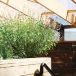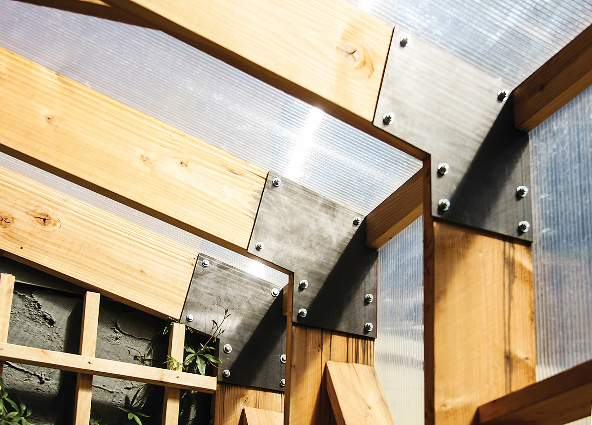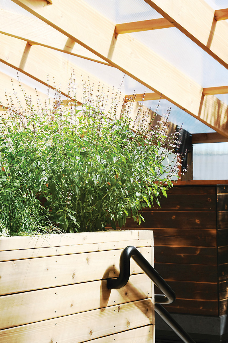Prie pietinės pastato sienos studijos „Studio North“ architektai prijungė visiems metų laikams pritaikytą stiklinį priestatą, kuriame namo gyventojai ir svečiai galėtų leisti laiką vienu metu būdami ir po stogu, ir po atviru dangumi. Šis žiemos sodas bendras visiems trims butams.