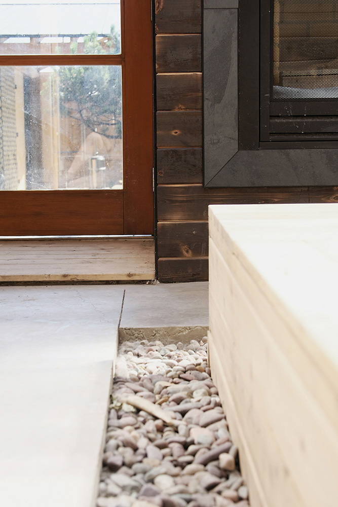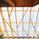 Įžambiai suskirstyti langų rėmai primena medžių šakų sudaromą ornamentą ir ant grindų meta žaismingą šešėlį. Terasinės grindys su jose įmontuotais augalų konteineriais, krėslai suteikia galimybę atsipalaiduoti ir prasiblaškyti stebint gamtą skirtingais sezonais.
