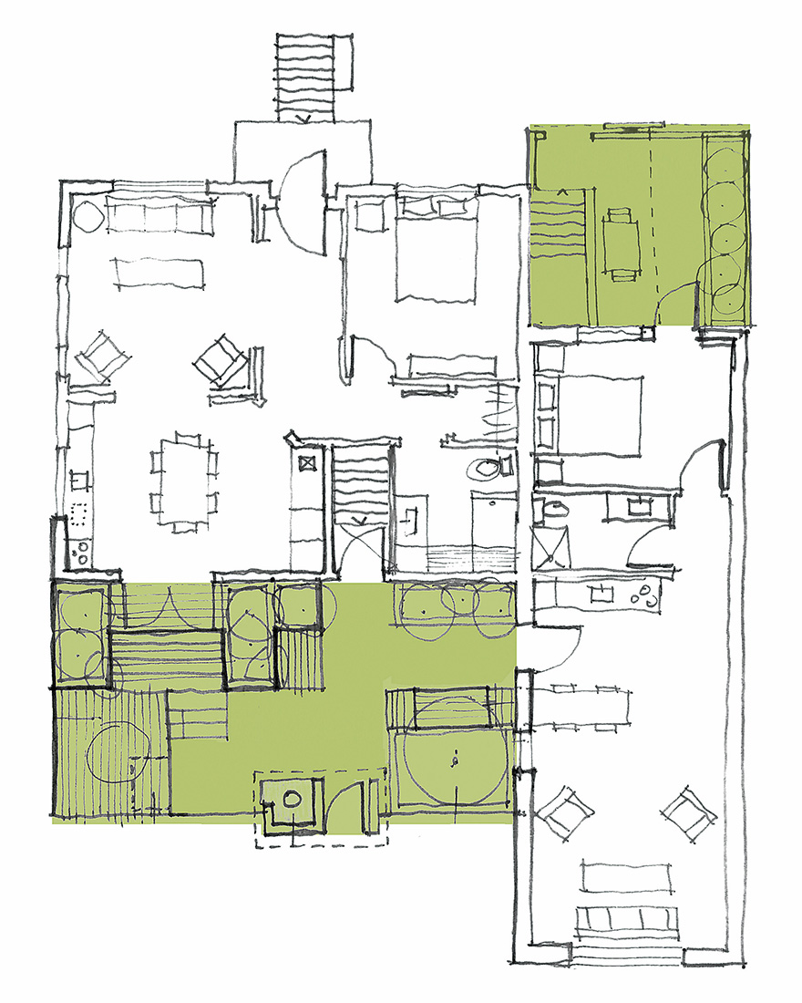 Architektai išradingai pasitelkė kelias strategijas, padedančias sutaupyti ploto. Namą teko pritaikyti prie užsakovo greito gyvenimo ritmo, taip pat sudaryti galimybę jame apsistoti draugams, giminaičiams. Rūsys, garažas ir pagrindinė gyvenamoji erdvė perdaryti taip, kad būtų sukurti trys vienas nuo kito atskirti nedidukai butai, tarpusavyje sujungti žiemos sodu ir kiemeliu kitoje namo pusėje.