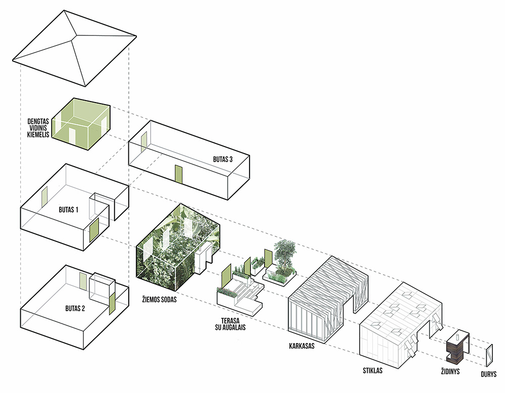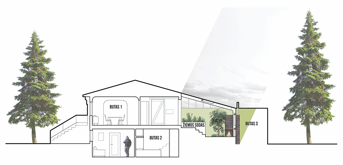 Bendradarbiaujant su vietos gamtinės žembdirbystės kultivuotojais, žiemos sodas įrengtas taip, kad vešėtų be jokios ypatingos priežiūros, jo gyvavimui beveik neturėtų įtakos šeimininko darbo grafikas. Permatoma polikarbonatinė stogo ir sienų danga sudaro galimybę maksimaliai išnaudoti pietų pusės teikiamus privalumus: pro ją į žiemos sodą sklinda išsklaidyta šviesa, kuri labai patinka augalams ir sukuria jaukią bendravimo erdvę žmonėms.
