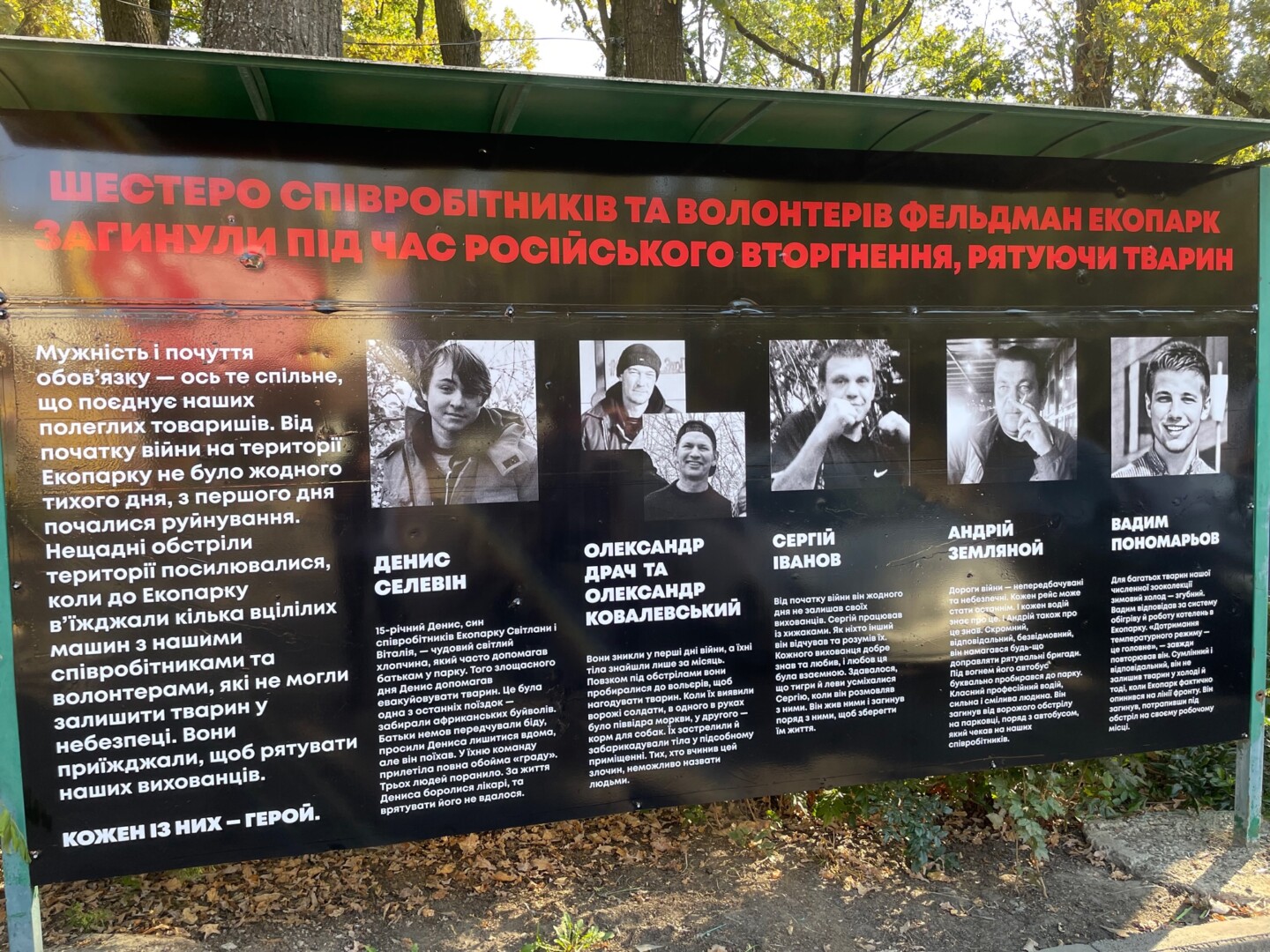 „Iš penkiolikos pasilikusių darbuotojų šeši žuvo. Mačiau keturių kolegų agonijas. To vaizdo niekada nepamiršiu ir niekada neatleisiu žudikams“, – kalbėjo Feldmano ekoparko direktoriaus pavaduotoja Svitlana Višnevecka.
