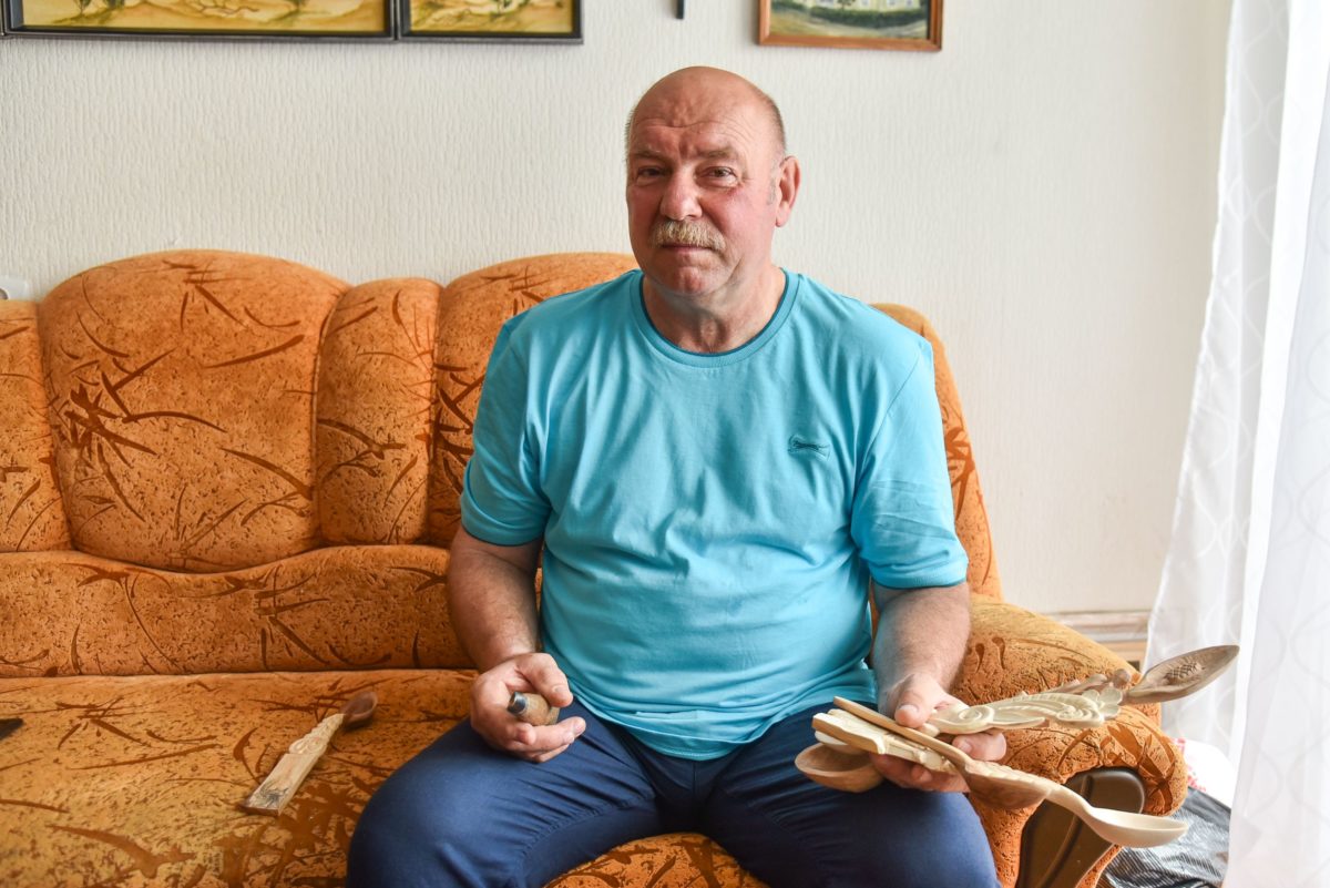Žmonai darydamas šaukštus mėgsta tulpės žiedus juose išdrožti. „Juk Tulpių gatvėje gyvename“, – juokiasi Viktoras. P. Židonio nuotr.